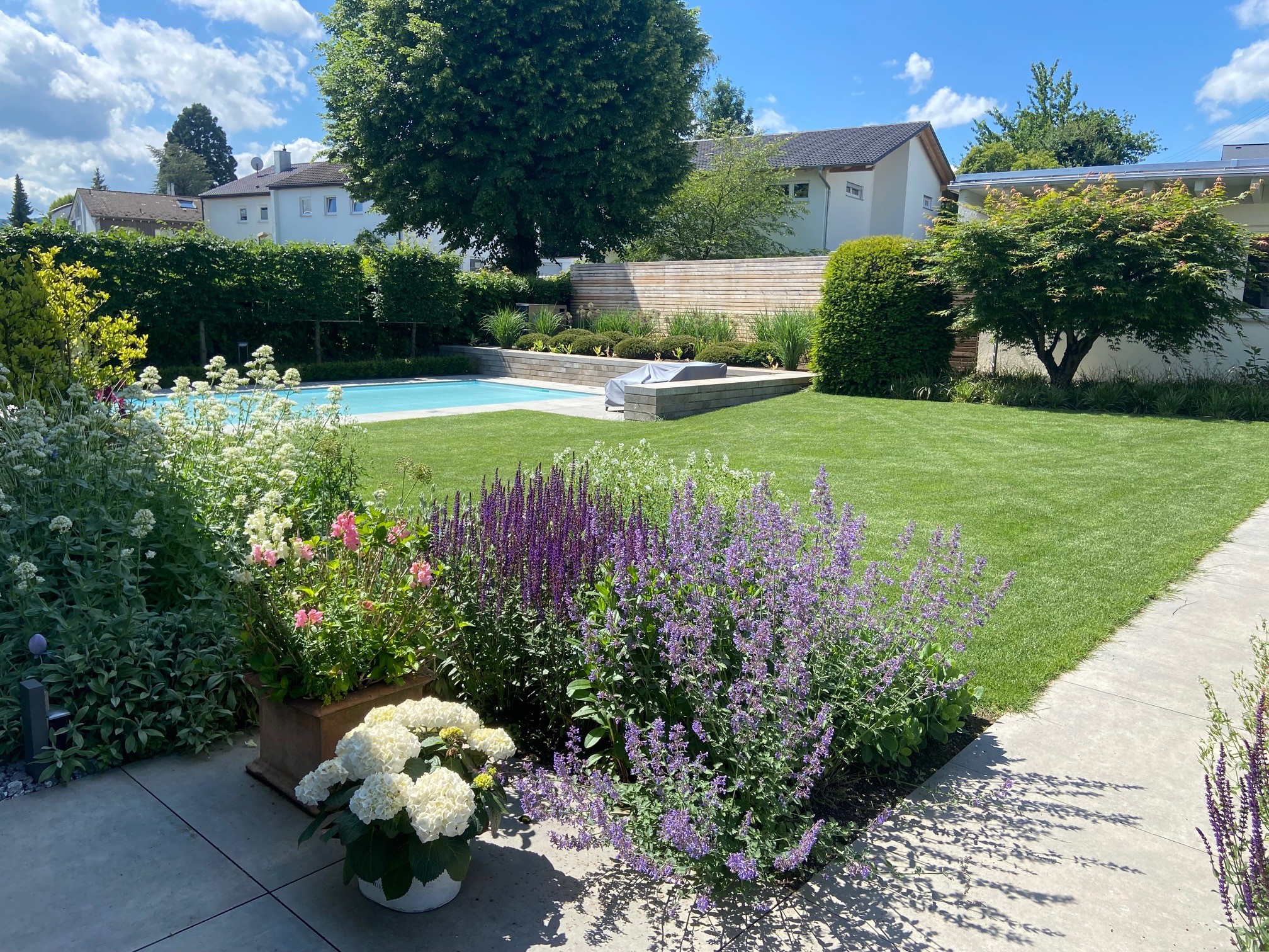 Moderne und repräsentative Gartenumgestaltung mit Outdoor Pool und toller Pflanzung.