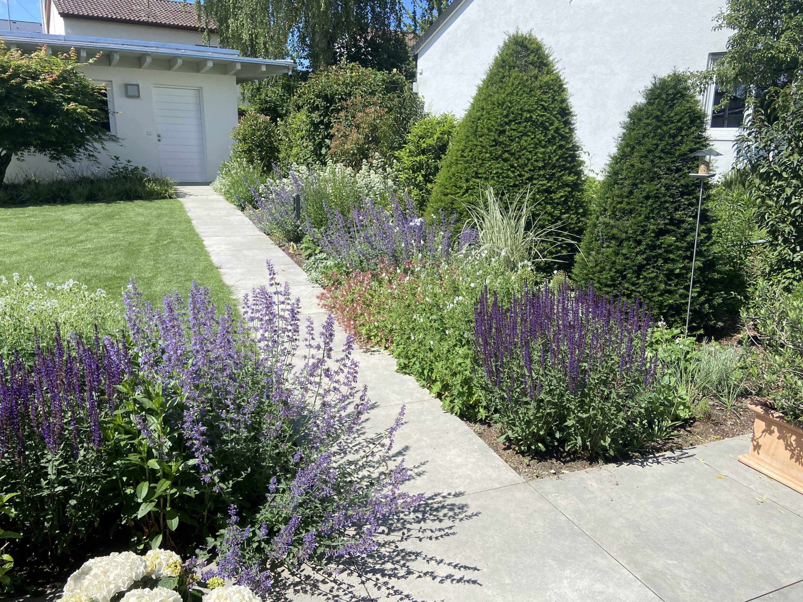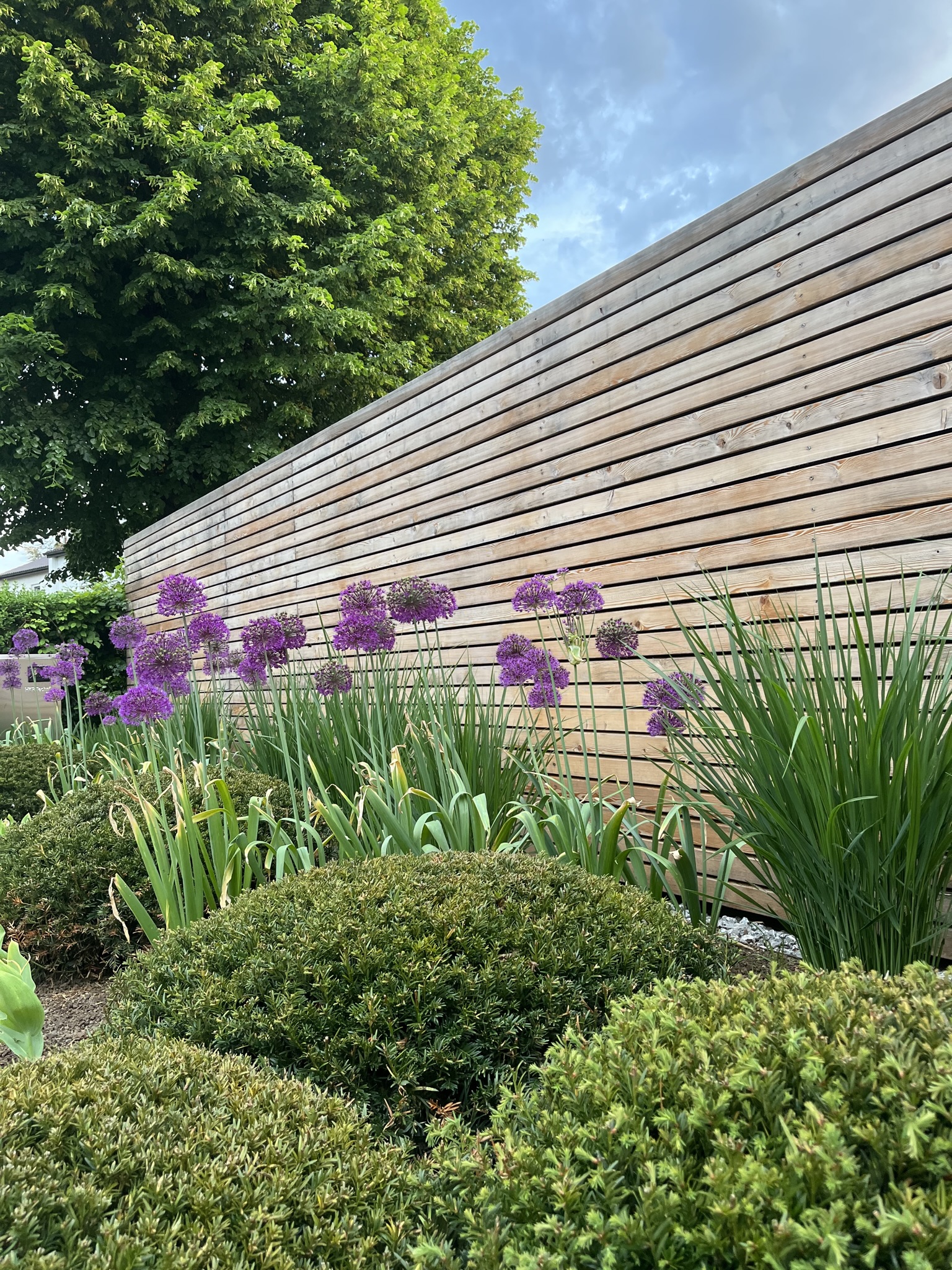 - Pflanzung vor dem Sichtschutz mit Solitärgräsern und geschnittenen Eibenlinsen
