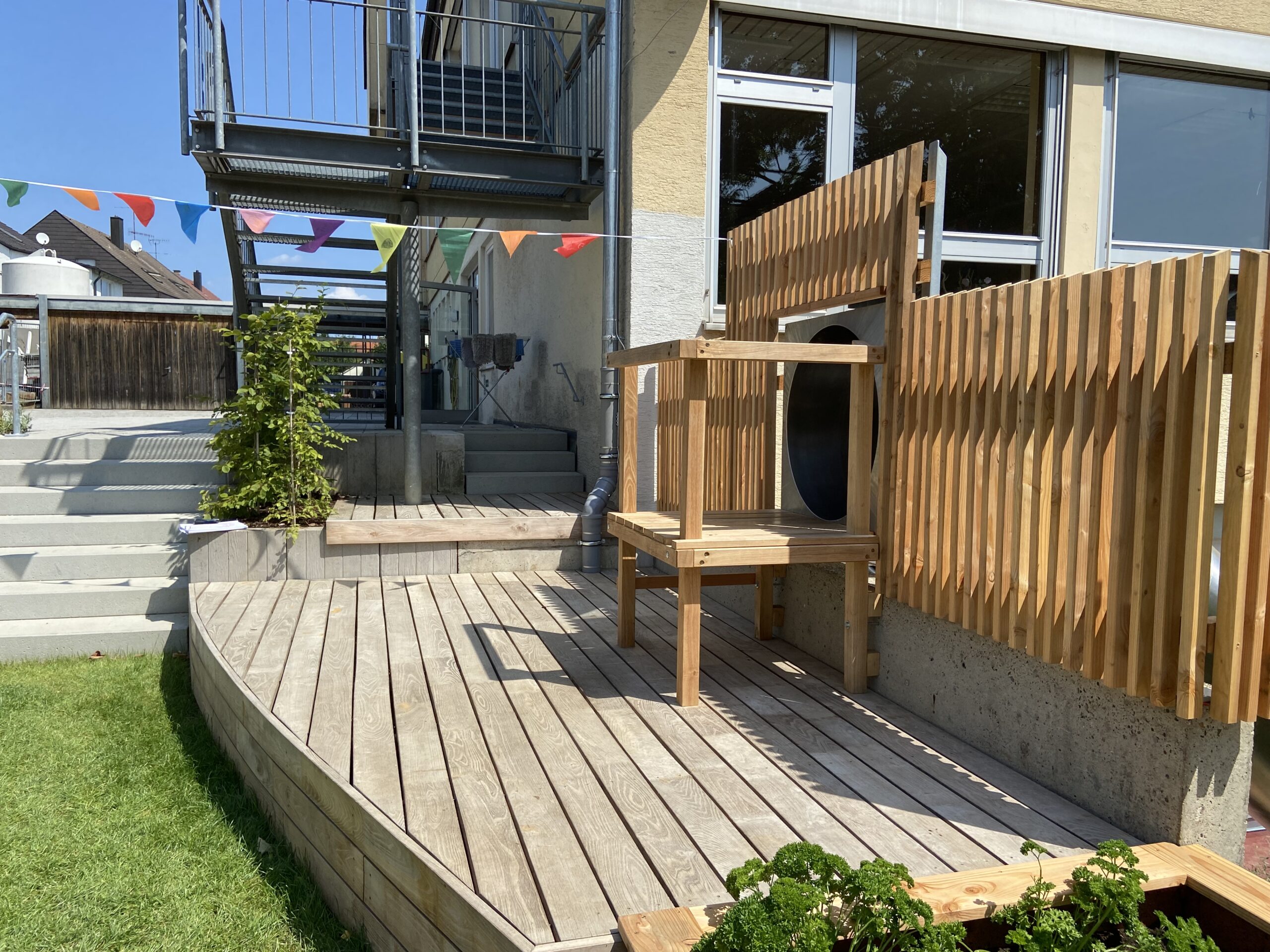 - Gestaltung des Holzdecks als Aufstieg zur Tunnelrutsche mit Robinien-Terrassendielen